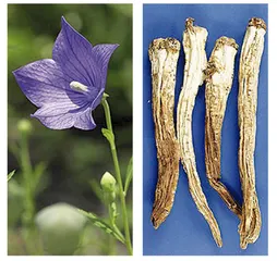 漢方では咳きを止め・痰を取り・膿を排泄する効能があり、咳き、咽の腫れ痛み、下痢などに用います。また「諸薬(しょやく)の舟楫(ふなかじ)」と呼ばれ、他の薬の効き目を舟で乗せて肺などの体の上部へ運ぶような働きがあることから多くの漢方処方に応用されています。上気道炎や咽喉炎などでのどが痛み、声が枯れるときに生薬の生甘草(しょうかんぞう)と配合した「桔梗湯(ききょうとう)」。膿性鼻汁がみられるときは「葛根湯加桔梗石膏(かっこんとうかききょうせっこう)」。慢性化した中耳炎などには「小柴胡湯加桔梗石膏(しょうさいことうかききょうせつこう)」。皮膚の化膿症に「排膿散及湯(はいのうさんきゅうとう)」などがあります。文字の木へんをとれば「更に吉」と読み縁起が良い家紋とされ、根は食材にもなり、生薬として病を癒す助けとなり、古代より人びとに貢献してきたありがたい生薬といえます。